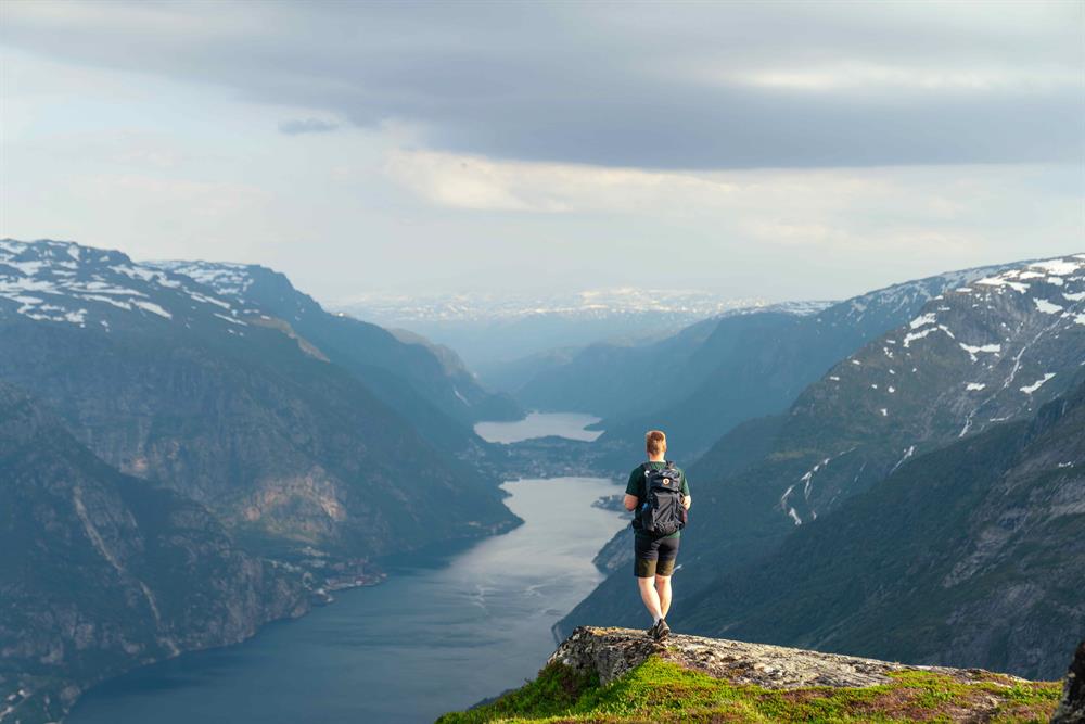 Jordalsnuten in Odda offer a spectacular panoramic view towards majestic mountains, the Hardangerfjord, Folgefonna glacier and deep valleys.